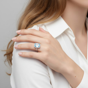 Bague Or blanc 375 Topaze Bleue traitée Coussin 14x10mm et Diamant