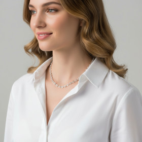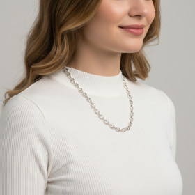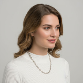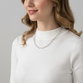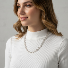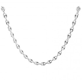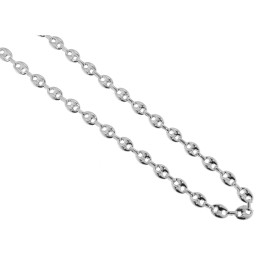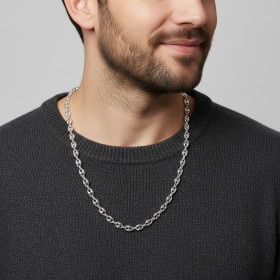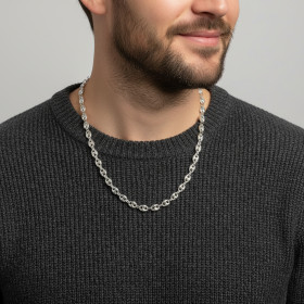 Comme son nom l’indique, cette maille ressemble à un grain de café. Elle est en effet ovale et percée de deux trous. La maille grain de café est le plus souvent pleine, ce qui signifie qu’une chaîne constituée de ce type de maillons est plus lourde qu’une simple chaîne maille gourmette ou maille cheval. Dans les chaînes en argent que nous vous présentons ici, chaque maille grain de café est imbriquée dans une maille ronde plus petite, laquelle assure la liaison entre deux grains de café. Cette alternance de maillons ovales et de petites mailles rondes donne au collier une allure à la fois élégante et originale.