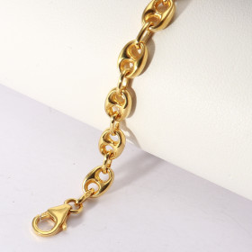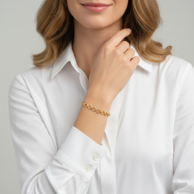 Le bracelet en or se décline dans toutes les sortes de mailles. Plate, la maille anglaise est intemporelle, de part son rendu classique. La maille haricot lui ressemble réellement à la différence qu’elle est plus large. Très appréciée pour un bracelet femme et un collier or jaune, la maille palmier est idéale pour avoir un bracelet avec un poids important en or, lié à la densité du tressage de la maille. Elle a un petit lien de ressemblance avec la maille corde, torsadée, tout en volume. La maille américaine forme naturellement un bracelet or jaune épais, en raison de l’entrelacement très serré des mailles, tout comme la maille royale, qui donne un esprit sophistiqué aux bijoux en or. Très tendance, la maille forçat peut être agrémentée d’un fermoir mousqueton. Basique et simple, elle ressemble à la maille jaseron, qui est une alternance de mailles rondes et ovales, tandis que la maille forçat n’a qu’une seule forme de maillons. Plus féminine que la maille gourmette ou ovale, elle donne une touche androgyne à une tenue. Elle est souvent utilisée pour la confection de chaine de cheville en or jaune. Reconnaissable entre toutes pour sa forme atypique, la maille grains de café est idéale pour un bracelet homme . Tout en rondeur, chaque « grain de café » est percé de deux trous qui permet de relier les mailles entre elles. Classique de la joaillerie, le bracelet jonc or bracelet jonc en or
