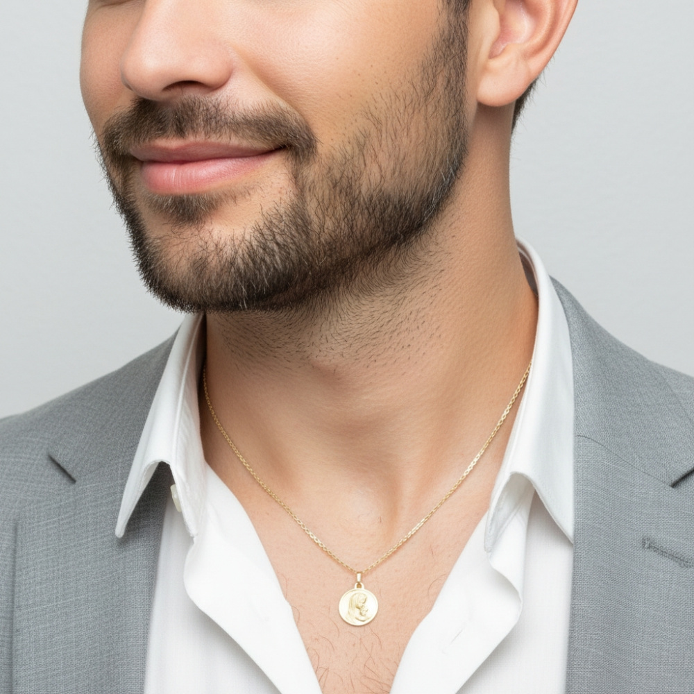 Voici une médaille en or jaune 750 représentant la Vierge portant son enfant dans ses bras.