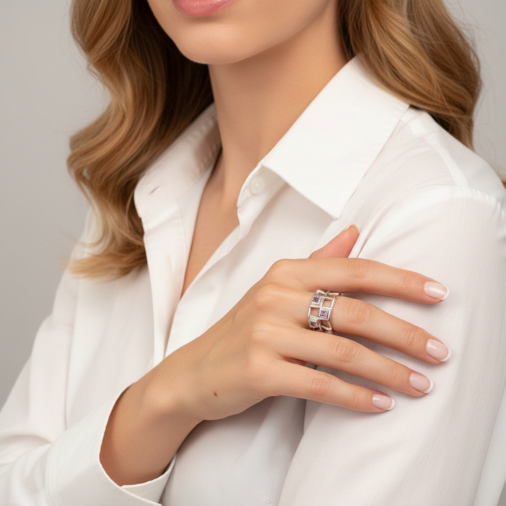 Cette bague en argent sertie d'améthystes surprend de par son originalité. Elle attire l'attention en raison de sa massivité. Le détail le plus captivant porte sur son anneau qui prend la forme de plusieurs petits carrés aérés. Certains de ces petits cubes ont été délicatement comblés par des améthystes taillées en facette et de forme carrée également. Toutes les pierres sont maintenues par serti clos. Elles révèlent une douce couleur violine propre à l'améthyste dont on sait porteuse de créativité et de sérénité.