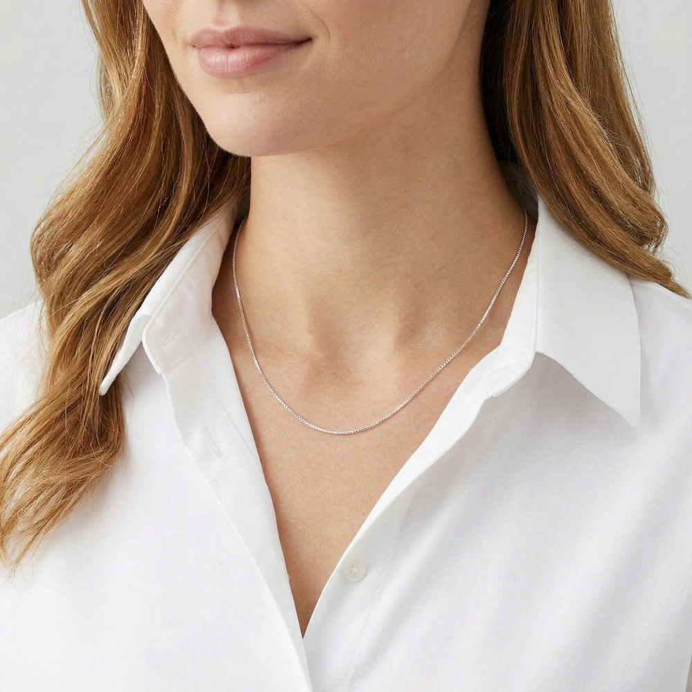 Cette chaine de cou en argent présente des mailles vénitiennes constituées de plusieurs maillons cubiques.