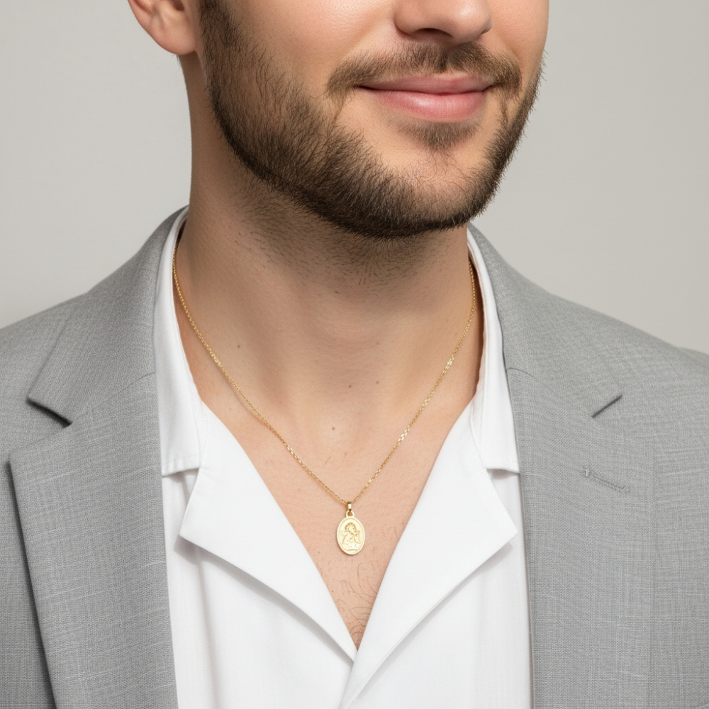 Cette médaille bébé ovale est un modèle classique qui arbore la créature céleste, l'ange Raphaël. Sculpté en or jaune 18 carats, l'ange Raphaël est, comme toujours, éternellement pensif. Son regard est tourné vers le haut et son menton est au creux de sa main. L'archange, représenté dans un cadre d'autrefois apparait en relief. La médaille de baptême renvoie un effet satiné sur les deux faces et est rehaussée par une bordure éclatante. Cette médaille est un symbole de protection spirituelle, à porter à la naissance et toute la vie.