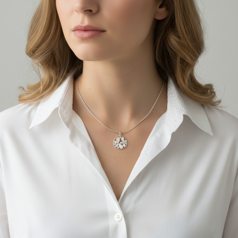 Vos autres effets de plage feraient mieux de bien se tenir. Ce pendentif en argent 925 va attirer toutes les attentions pendant vos vacances. Les motifs fleurs que lui ont réservés nos bijoutiers dégagent beaucoup de bonne humeur, avec leurs contours naïfs et l'incrustation de nacre véritable. La teinte rose du minéral rajoute de la fraîcheur à l'ensemble limité par un contour rond. Une bélière dotée d'un passant large vous permet d'agrémenter un ras-de-cou en ruban velours, un jonc ou une chaîne avec ce même bijou.