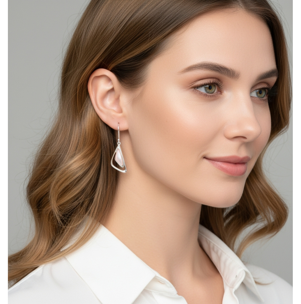 Ces jolies boucles d'oreilles adouciront les traits de votre visage. Elles sont de forme pendante avec des motifs en triangle, décorés de nacre rose. La monture est en argent et le motif est constitué d'un triangle ajouré. Celui-ci contient un deuxième triangle plein orné de nacre et placé tout en haut. La nacre est maintenue en serti clos et le motif est fixé au crochet. Ces bijoux sont en argent et elles présentent des corps lisses et brillants.