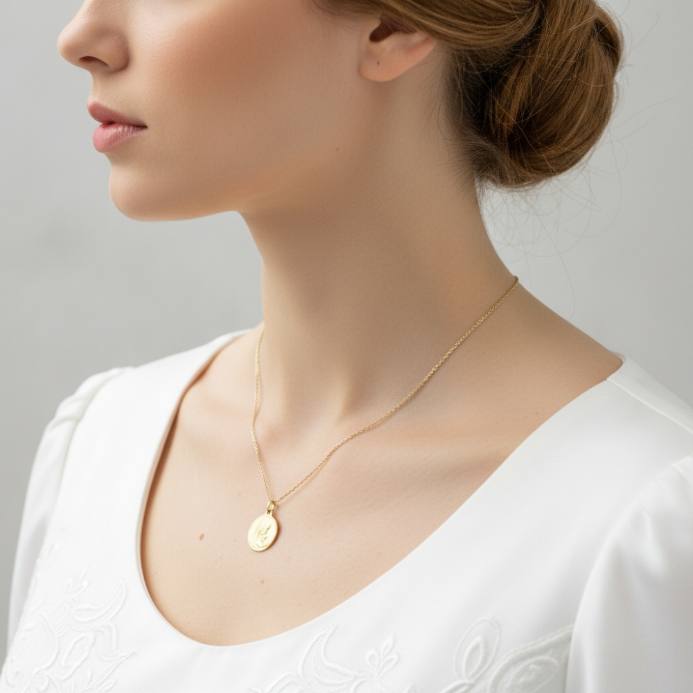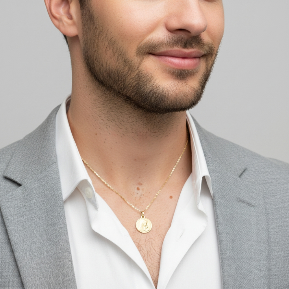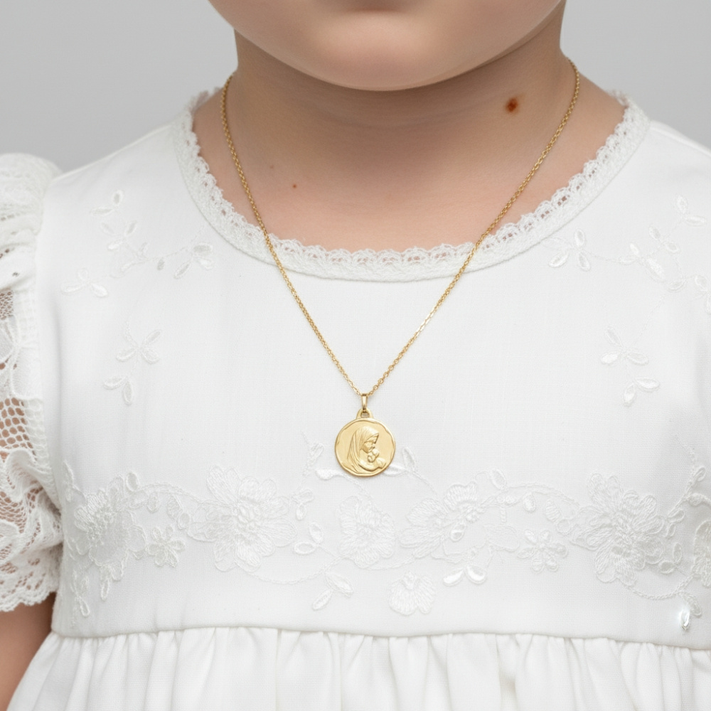 Cette médaille en or jaune de 18 carats propose une jolie image symbolisant l'amour maternel. On y voit la Vierge en train d'entourer l'enfant Jésus dans ses bras. Les lignes épurées et simples de ce bijou en font une pièce de qualité. La finition satinée suffit à mettre en valeur l'élégance et la finesse des gravures dont les détails sont d'une grande netteté. Les bords irréguliers dévoilent un travail de cisèlement remarquable. Le bijou comporte une zone de gravure, le rendant ainsi personnalisable.