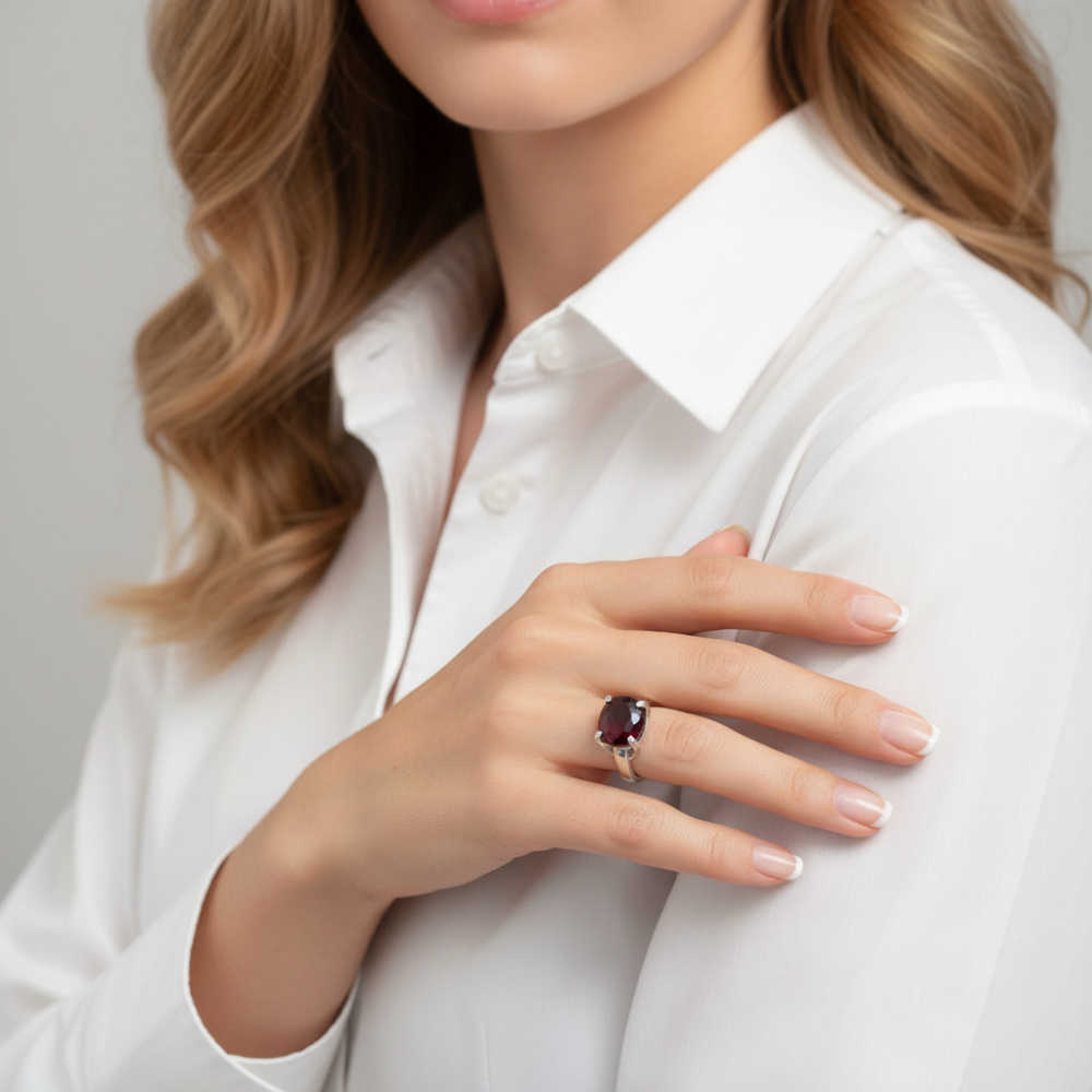 Cette bague en argent n'a qu'une raison d'être : habiller en toute subtilité le doigt de ces dames. Ce ravissant bijou à l'allure compacte doit toute son originalité à son volume apparent. Il est orné d'un grenat rouge taillé en coussin. L'effet de massivité se dégageant de la bague est atténué par le serti-griffes choisi par nos bijoutiers. La technique contribue à aérer et alléger cette pièce de joaillerie qui sublimera toutes les tenues vestimentaires .