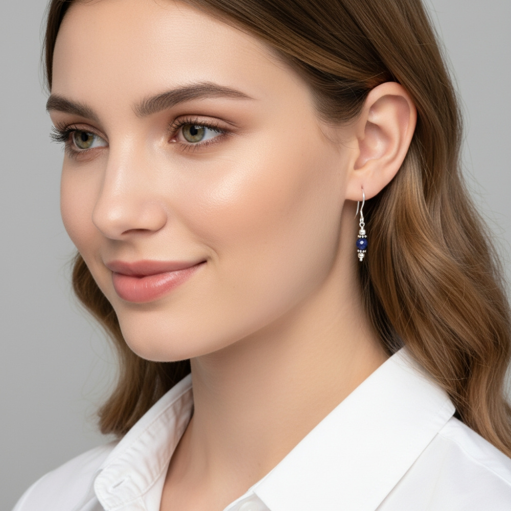 Ces boucles d'oreilles en argent s'apprécient pour leur style ethnique et féminin. Elles sont élégamment ornées d'un lapis lazuli rond, émaillé directement dans le métal précieux. La pierre fine aux tons bleus sombres est bordée par des perles d'argent sur sa partie supérieure et sa partie inférieure. Ces détails décoratifs laissent échapper quelques reflets noirs pour accentuer l'élégance du bijou dont le corps est parachevé par une fermeture à crochet classique mais confortable .