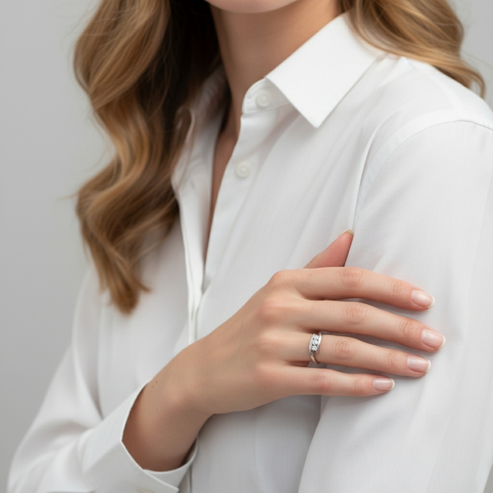 La bague en or blanc présentée est une création raffinée de la maison Trabbia Vuillermoz. Cette bague se distingue par son design élégant et moderne, mettant en valeur trois diamants étincelants. Chaque diamant est finement serti dans un anneau d'or blanc poli, créant un contraste lumineux et sophistiqué. La disposition des diamants en ligne évoque une continuité et une pureté, soulignant l'éclat naturel de chaque pierre précieuse. L'anneau en or blanc, légèrement incurvé, ajoute une touche de fluidité et de modernité à l'ensemble. Cette bague symbolise à la fois l'élégance intemporelle et le savoir-faire artisanal de Trabbia Vuillermoz. Elle est idéale pour les occasions spéciales comme un anniversaire, une célébration ou simplement pour se faire plaisir avec un bijou unique et précieux. La qualité des matériaux utilisés, associée à une expertise artisanale remarquable, fait de cette bague un témoignage durable de l'engagement de la marque envers l'excellence et la beauté. En portant cette bague, on porte une pièce d'art qui incarne la tradition et l'innovation, la passion et l'authenticité, des valeurs chères à la maison Trabbia Vuillermoz. C'est bien plus qu'un bijou; c'est une histoire à porter, un lien entre le passé artisanal et le présent moderne, un éclat de lumière pour les moments précieux de la vie.