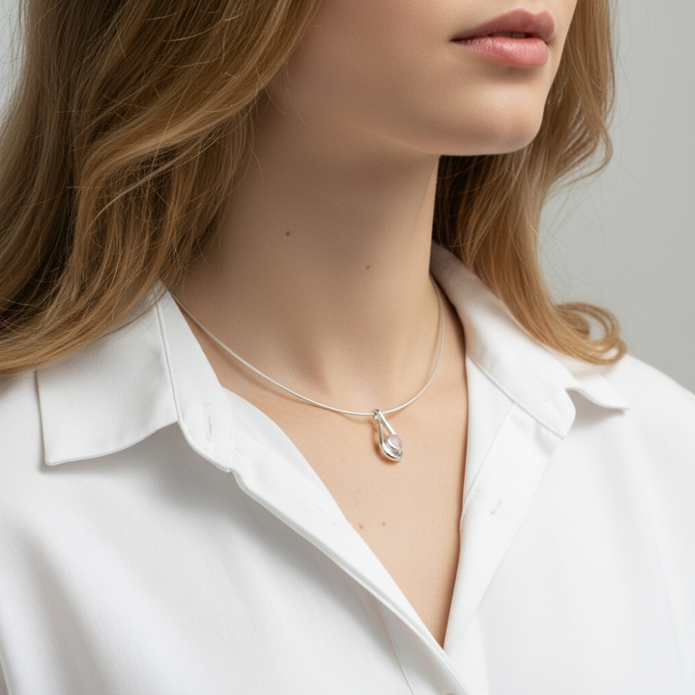 Vous recherchez un pendentif à la tonalité claire et qui aura pour effet de relever votre style avec grâce, choisissez celui-ci. Il présente une forme en poire avec la particularité de former lui-même la bélière en dessinant une boucle sur le haut. La monture est argent et elle est agrémentée d'une nacre rose de forme ronde. La nacre est fixée en serti clos au centre de la monture, elle est entourée d'un corps à l'apparence spirale. Ce joli bijou brillera de tout son éclat à votre cou et il décorera naturellement un collier de la même matière.
