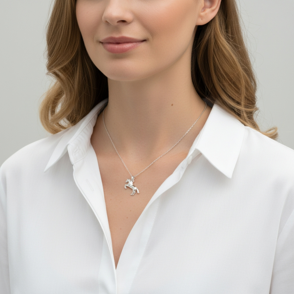 Passionnée de chevaux, ce pendentif est celui qu'il vous faut. Il présente un cheval cabré qui est posé sur ses deux pattes arrière et celles du devant sont recourbées. La bête est sculptée soigneusement dans du métal en argent, on note les rainures qui dessinent sa crinière sur le haut ainsi que sa queue. Ce pendentif est doté d'une bélière, elle est de forme triangulaire et accrochée à un petit anneau fixé au dos du cheval. En guise de cadeau, ce pendentif cheval ne pourra que surprendre sa future propriétaire.