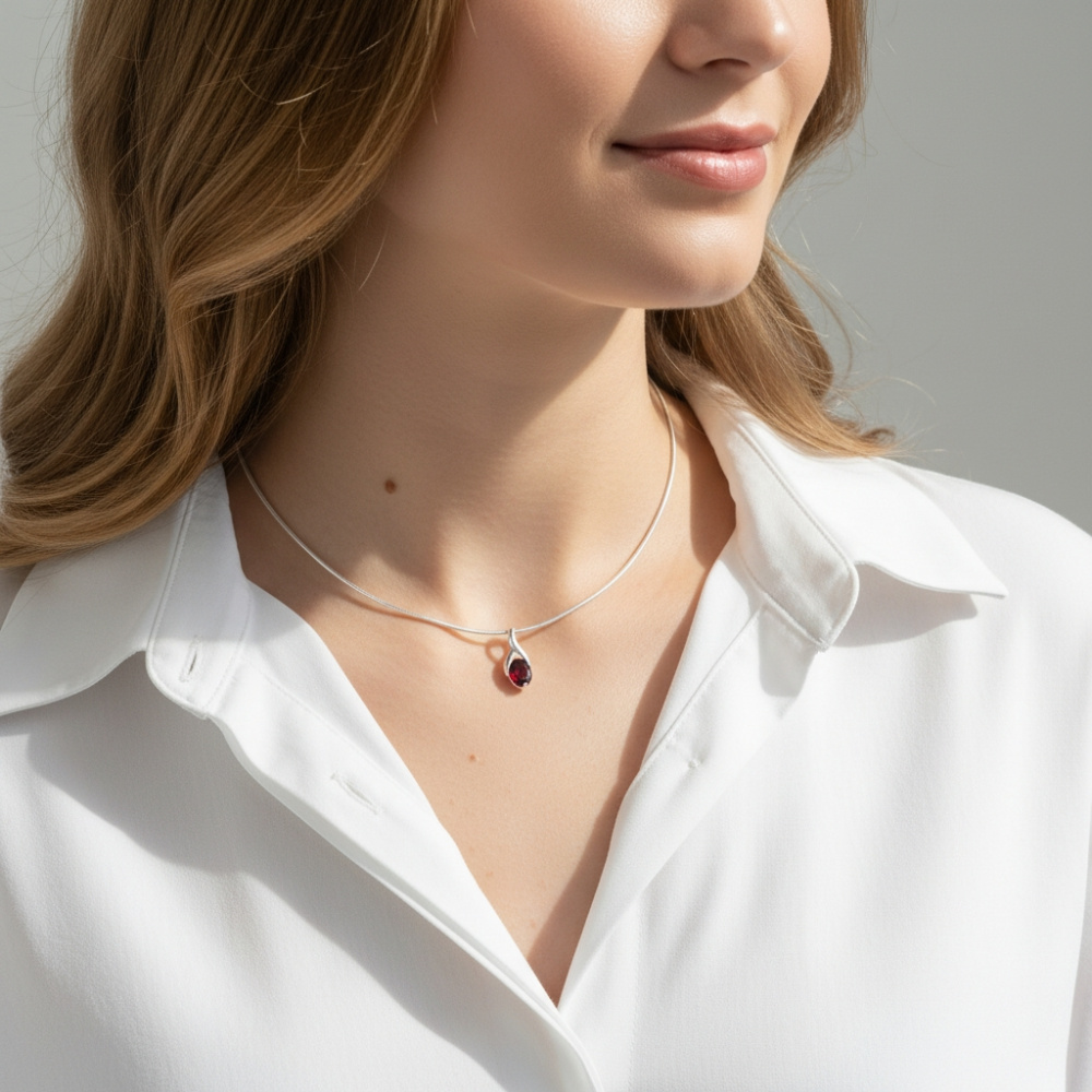Le rouge et le gris forment une belle alliance sur ce pendentif en argent 925. Le rouge apporté par le grenat venant orner cette ravissante monture donne du dynamisme au bijou. Elle est a été fixée en serti demi-clos au-dessous du motif torsadé constituant la monture. Élégante et intemporelle, cette pièce de joaillerie traversera les années sans perdre de son esthétisme.