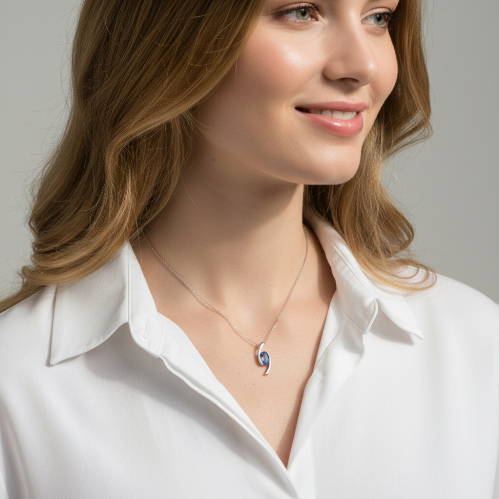 Le saphir, cette pierre à la couleur bleu intense agrémente avec élégance ce pendentif pour femme.