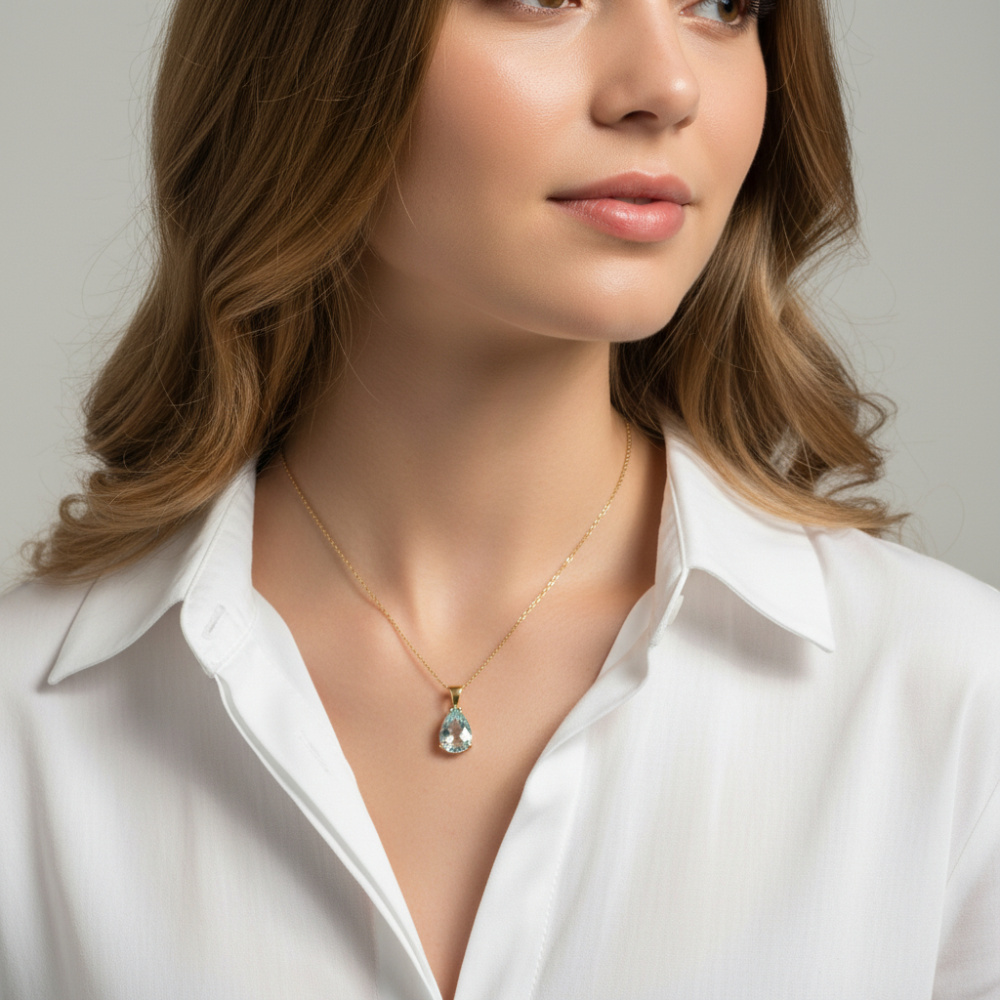 L'aigue-marine, cette ravissante pierre aurait comme vertu de fortifier son propriétaire et d'assurer un mariage heureux. Messieurs, vous avez trouvé ici le parfait cadeau pour votre tendre moitié, ce joli pendentif en or jaune. Sa monture est composée d'une bélière à la forme triangulaire et faisant partie intégrante de ce pendentif. Un chaton à quatre griffes accueille avec finesse la pierre de forme ovale en laissant cette dernière inondée de lumière pour un effet des plus transparents et brillants .