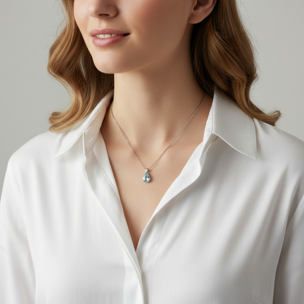 Ce pendentif pour femme ne manquera pas de briller à votre cou. Il est joliment agrémenté d'une aigue-marine taillée en poire. Elle est accueillie dans un chaton à quatre griffes qui favorise une pénétration au maximum de la lumière. Transparente et brillante, la pierre s'accorde parfaitement à sa monture en or blanc et la bélière à son sommet. Cette dernière est de forme triangulaire avec un aspect lisse et épuré, elle n'attend plus que votre chaine pour illuminer votre décolleté.