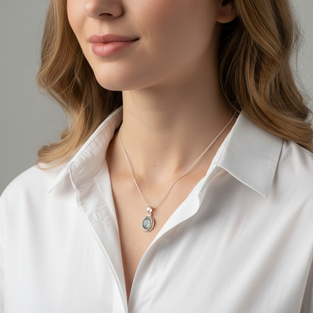 Par son élégante discrétion, ce pendentif en argent 925 viendra sublimer n'importe quel cou. À acquérir pour le plaisir ou pour faire plaisir, il est assorti d'une labradorite aux beaux reflets métallisés. La pierre fine de forme ovale est ici mise en valeur par un serti-clos volontairement épais. Elle est appréciée pour ses vertus, car elle serait capable de développer l'équilibre psychologique et la clarté d'esprit.