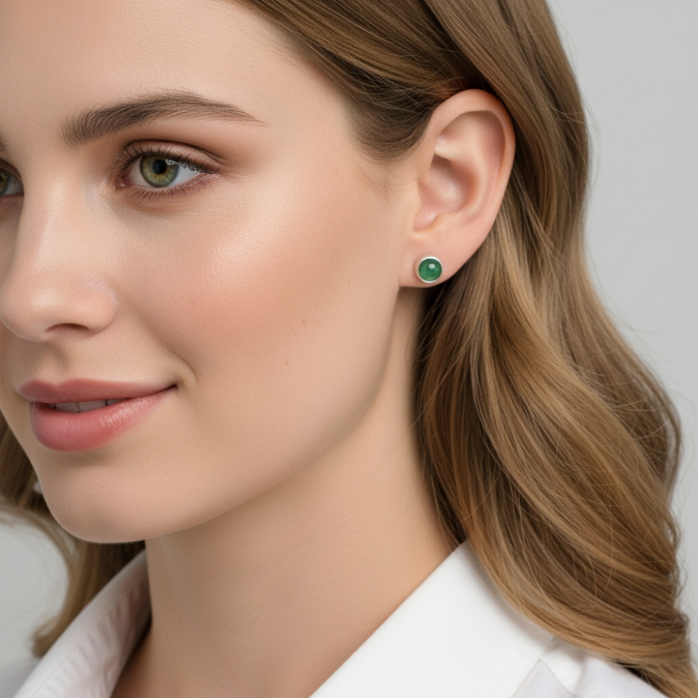 De forme ronde, les boucles sont serties d'une pierre aventurine de couleur verte.