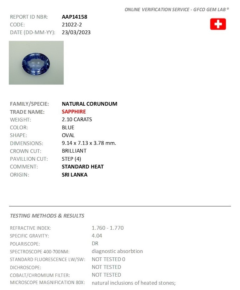 | Poids saphir | 2.10 ct. |
