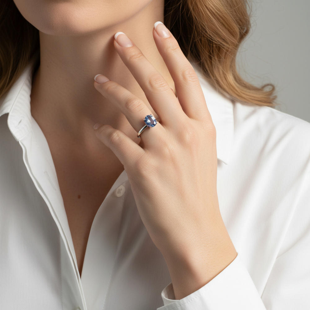 La monture sobre et élégante met en avant la pierre précieuse, la maintenant en place avec des griffes discrètes qui laissent passer la lumière de façon harmonieuse.