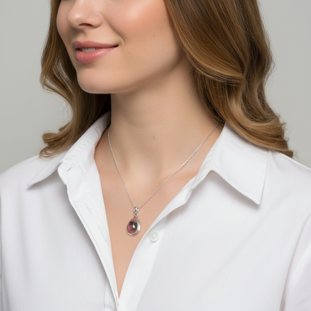 Impossible de rester insensible face aux lignes chics et épurées de ce pendentif féminin en argent. La monture épouse à merveille la forme de la rhodonite qui vient l'embellir. La pierre fine célébrée pour ses belles couleurs rouges est en forme de poire. Elle est maintenue par un serti-clos qui la protège des chocs et des rayures. Au sommet du bijou figure une bélière qui sert à placer la chaîne de cou. À rappeler que dans la tradition, la rhodonite serait une pierre équilibrante, réparatrice et protectrice.
