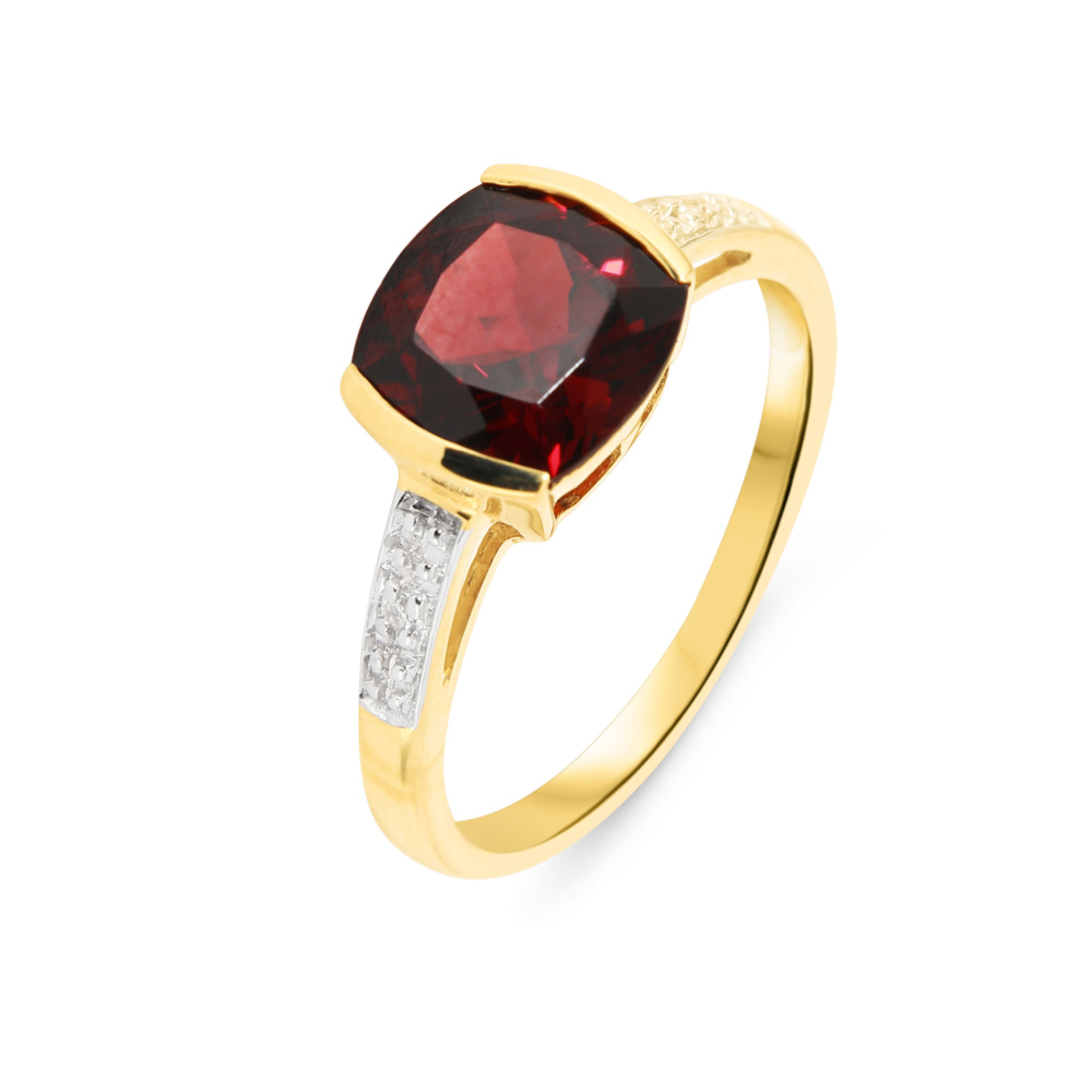 Cette bague en Or 375 est sertie d'un grenat taille coussin
