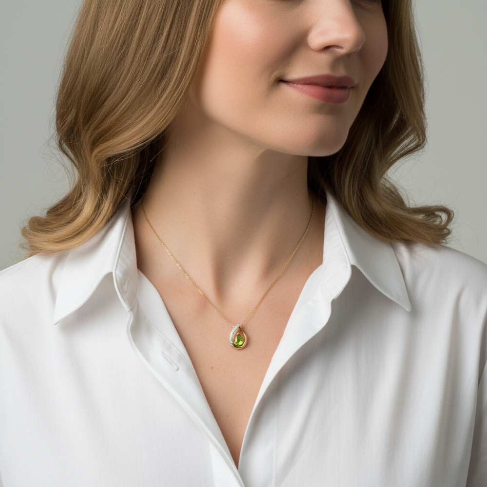 Ce pendentif deux ors offre en même temps un design plein de charme, des finitions rigoureuses et un vent d'élégance. Sa monture de forme ovale est appréciée pour sa modernité. Elle est ornée en son coeur d'un péridot vert qui rappelle le printemps. La première moitié de cette monture à la fois simple et féminine est en or blanc. Elle a été semée de quatre diamants relevant l'éclat de la pierre centrale. La seconde moitié quant à elle est en or jaune.