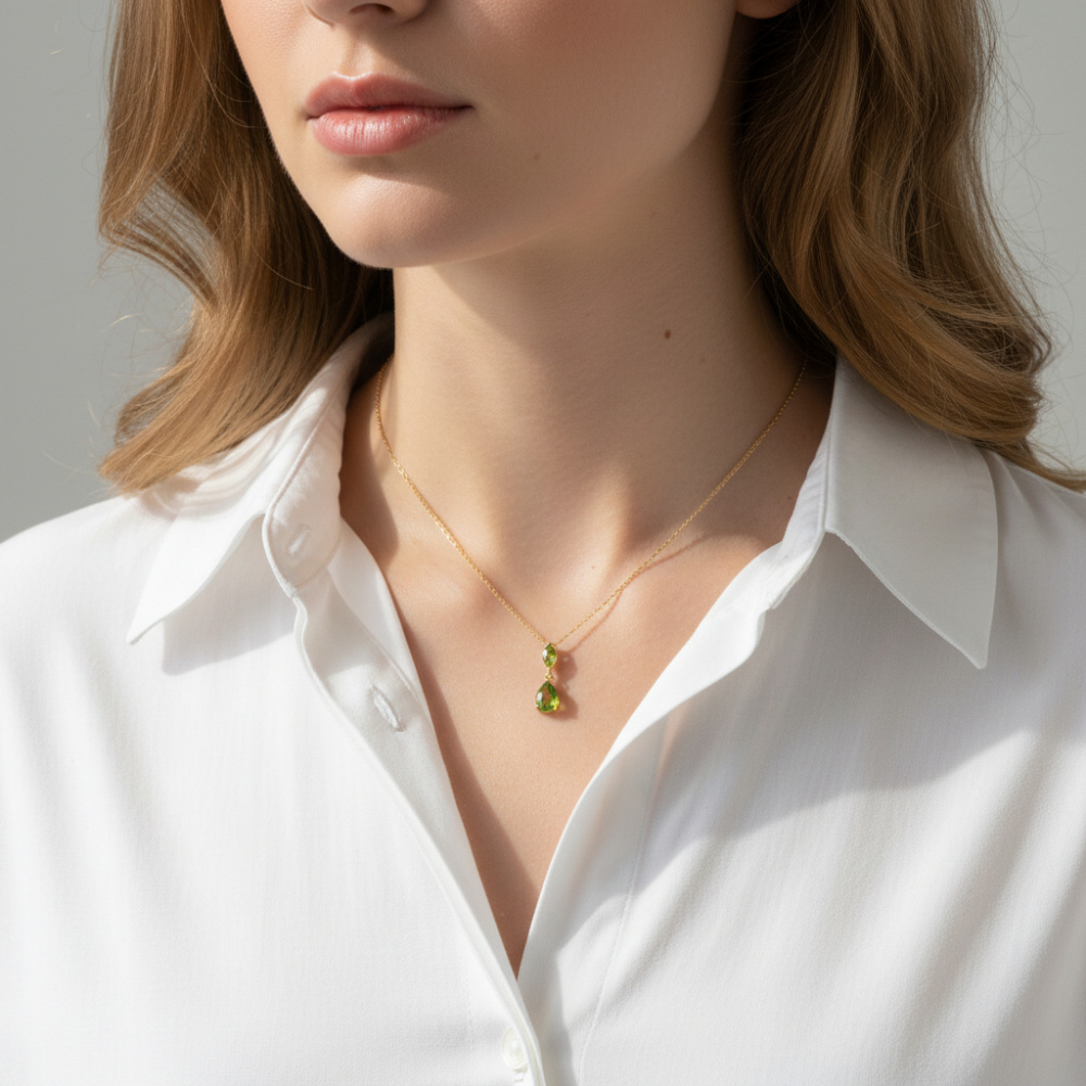 Ce pendentif pour femme à la tonalité printanière ne manquera pas d'apporter une note de gaieté à votre haut. Il est composé d'une monture en or jaune agrémentée de deux péridots. Les pierres sont disposées l'une au-dessus de l'autre reliées par deux petits anneaux. Le péridot du haut présente une forme marquise et il est monté sur une monture à griffes. Des griffes triangles prennent place à la pointe de chaque pierre. Le deuxième péridot est en poire et il est maintenu par une griffe triangle à la pointe et deux griffes boules sur la base. La bélière est située discrètement derrière la pierre .