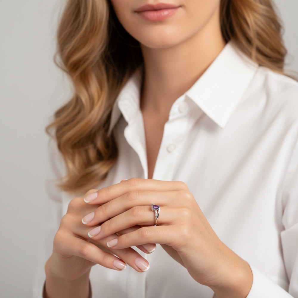 D'une belle couleur violette, cette pierre embellit cette bague avec délicatesse. Elle est disposée en demi clos et sa couleur rayonnante rehausse le métal de l'anneau en argent. Les oxydes de zirconium qui sont disposées de chaque côté brillent de tous leurs éclats. La bague dessine deux branches vers l'extérieur sur le haut avec un corps fin qui enveloppe délicatement le bout de la pierre de forme ovale. A celles qui sont réceptives aux bienfaits des pierres, l'améthyste ici vous apporterait de l'apaisement.