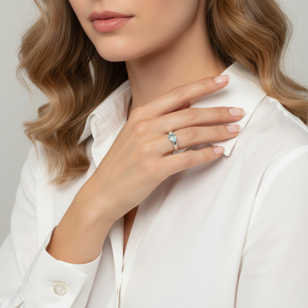 Cette bague brillera avec élégance à votre doigt. Sa pierre, une topaze bleue traitée, est d'une belle couleur qui est rehaussée par l'anneau en argent. La pierre de forme ovale trouve sa place dans une monture demi clos sur le dessus. Les deux côtés de la pierre sont enveloppés délicatement par la monture. L'anneau se dessine sous des lignes lisses et raffinées.