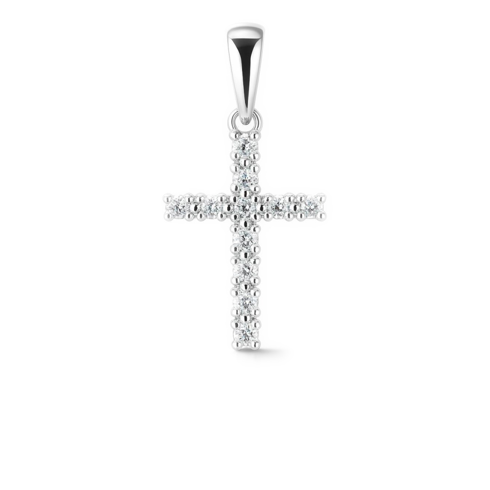 Parrains ou marraines, offrez cette jolie croix à votre filleul. Il peut être porté par un garçon ou une fille et grâce à la bélière qui se situe sur son sommet, elle est prête à être accrochée à leur cou. La croix est sertie de onze diamants au total, à la verticale et à l'horizontale. Un petit cercle est fixé tout au-dessus pour laisser passer la bélière. La monture de cette croix est entièrement en or blanc.