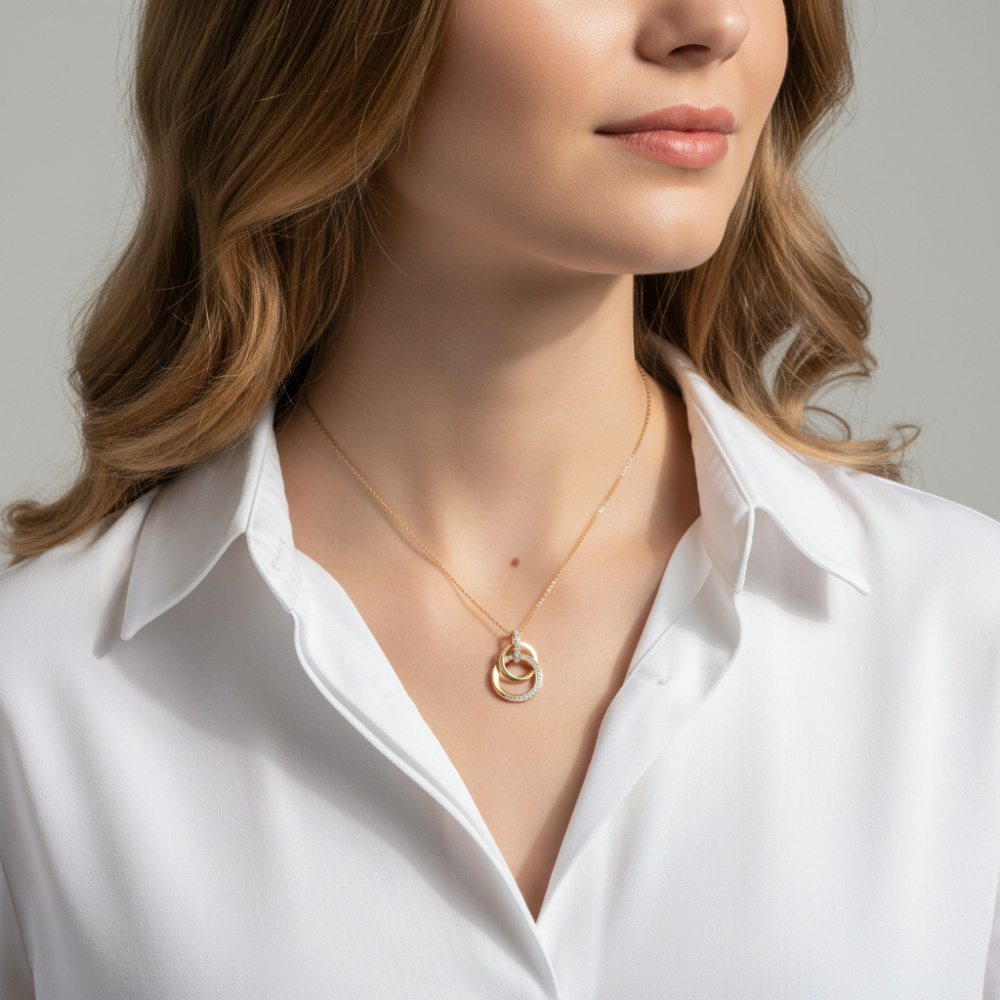 Ce pendentif à deux cercles est d'une telle beauté que vous ne pourrez que succomber à son design. Il est en or jaune et présente deux cercles, un petit et un grand qui s'entrelacent parfaitement. Plus de la moitié du grand cercle est pavé de diamants ainsi que la bélière qui présente un corps en longueur. Il dessine une petite bande qui passe au-dessus des cercles puis à l'arrière des cercles. Les diamants, au nombre total de dix sept brillent de tous leurs éclats et apportent une allure raffinée à ce ravissant pendentif .