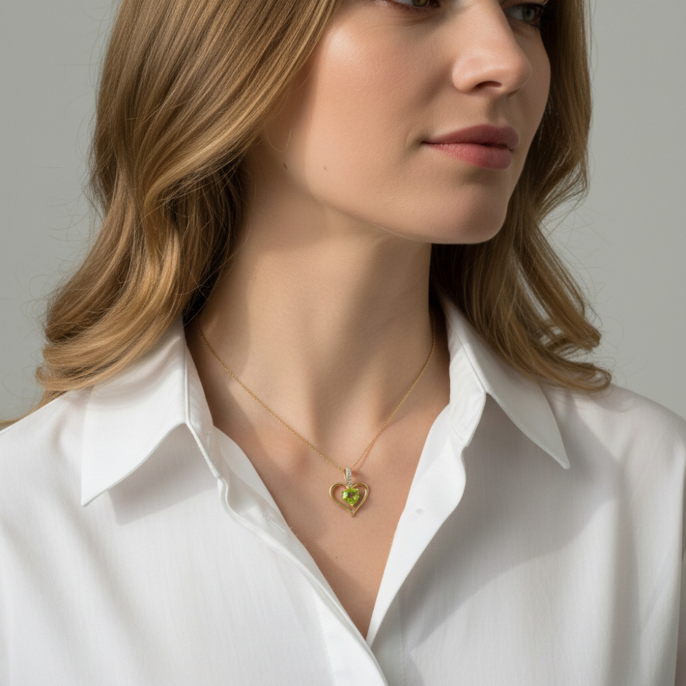 Ce pendentif est serti d'un péridot taillé en coeur mesurant 6x6mm