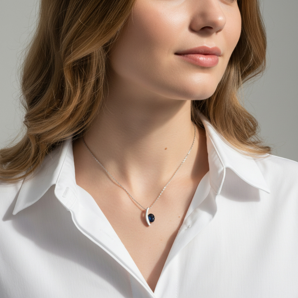 Ce pendentif en or blanc convient aux femmes de tout âge. Dans un style épuré et moderne à la fois, ce bijou est formé d'une tige de métal précieux légèrement recourbée près de laquelle vient se blottir un saphir. La pierre précieuse d'un bleu profond est maintenue de l'autre côté par une griffe. Le sertissage discret lui permet de révéler un bel éclat .