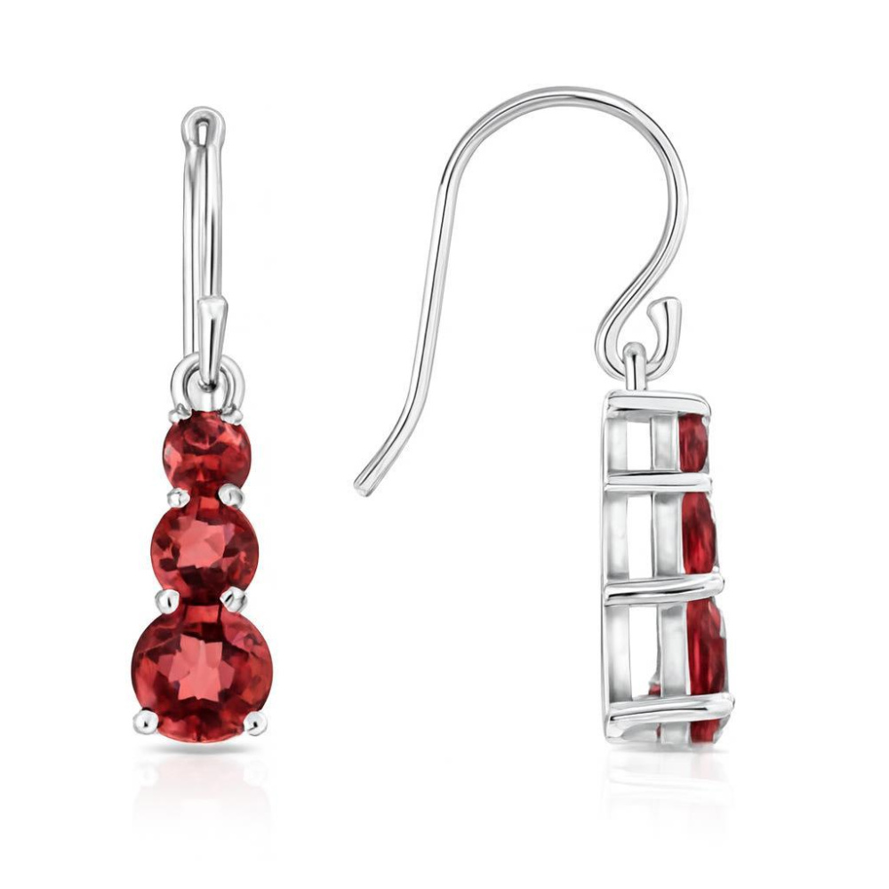 Pour accompagner vos tenues de tous les jours, adoptez ces jolies boucles d'oreilles. Leur style pendant accentuera votre côté féminin. Chaque boucle est composée d'un crochet et d'un motif orné de trois grenats. Les pierres sont de forme ronde et placée de la plus petite à la plus grande du haut vers le bas. Elles sont montées sur des corps à griffes en argent.