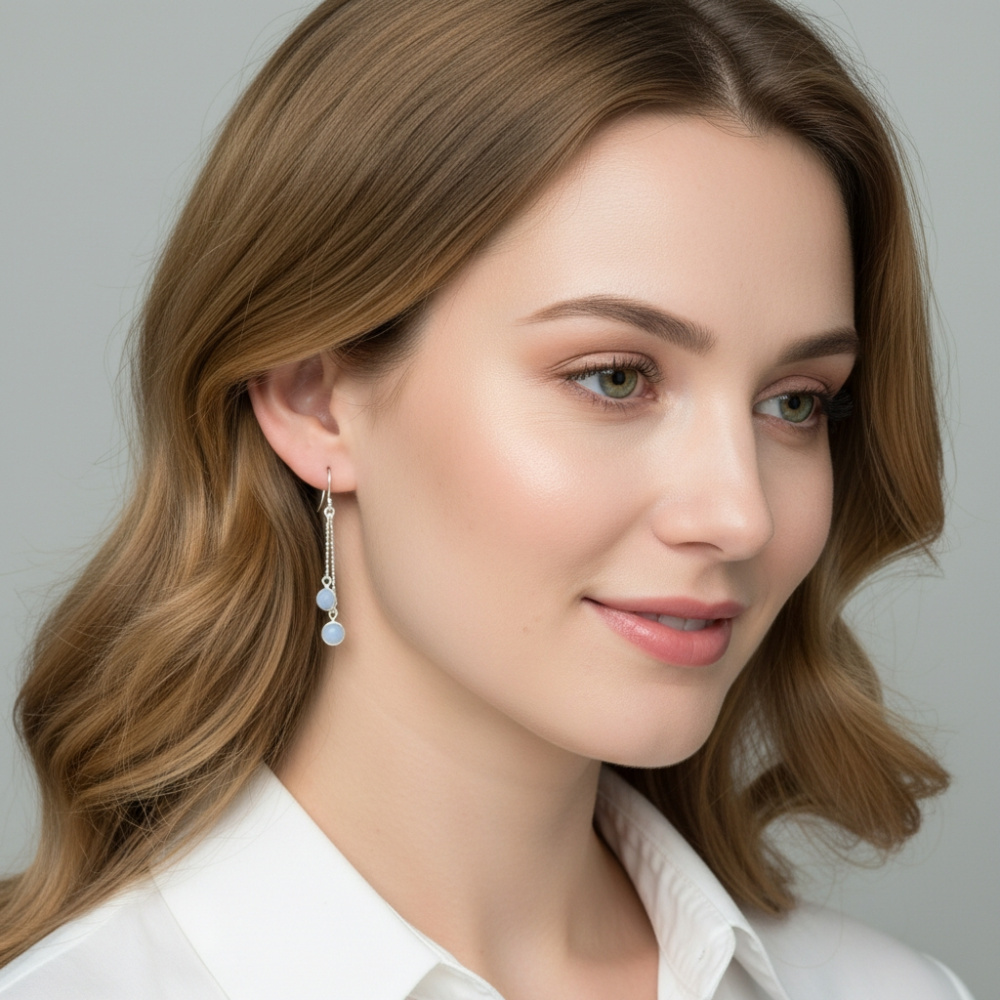 À la recherche de boucles d'oreilles à porter au quotidien, succombez aux charmes de celles-ci. Elles sont ravissantes et vous plairont pour leur forme pendante. Elles sont constituées par un crochet au niveau des oreilles puis deux chaînettes avec des motifs ronds à leurs extrémités y sont suspendues. Les chaînettes sont de longueur différente et à leur extrémité se trouve une calcédoine. Elle est de forme ronde et maintenue un fin corps qui entoure ses côtés. La pierre présente une douce couleur qui ne vous éblouit pas mais qui s'accorde bien avec la monture en argent qui l'accompagne.