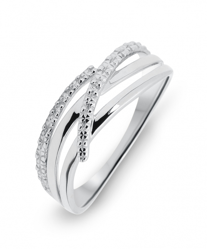Cette jolie bague en or blanc 750 présente 3 branches sur le dessus, qui s'unissent et ne forment plus qu'un en dessous. Deux de ses branches présentent des lignes pures tandis que l'autre est décoré de motifs. Celle-ci est découpée en deux, avec une extrémité qui vient se placer par-dessus les deux autres branches. Deux diamants ont été incrustés sur cette partie-là pour souligner le style recherché et raffiné de ce beau bijou .