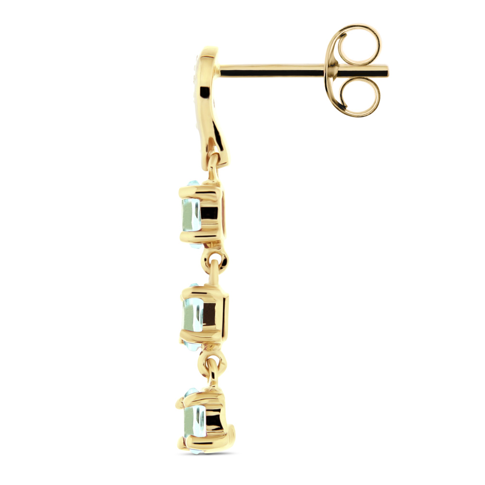 Ces boucles d'oreilles pendantes en or jaune 375 peuvent faire office de présent à des femmes déterminées et sûres d'elles. De par leur forme pendante, elles se caractérisent aussi par la présence des 6 topazes bleues traitées de forme ovale. Celles-ci leur procurent un aspect remarquable, dès le premier coup d'oeil. Elles sont également dotées de 2 diamants qui sont installés au niveau du fermoir. Se fermant aisément à l'aide de puces, ces bijoux sont légers et faciles à porter .
