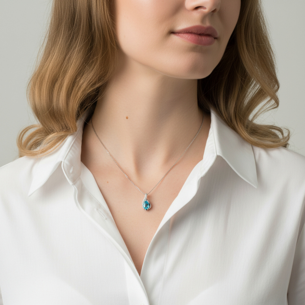 Pendentif en Or blanc 375 serti d'une topaze bleue traitée taille poire de 7x5mm et de 5 diamants