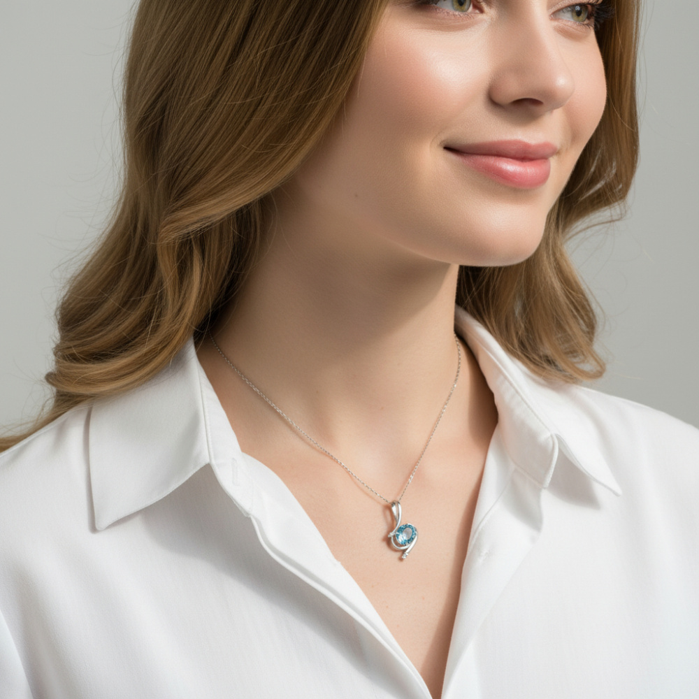 L'éclat et la beauté de ce pendentif fascineront celle à qui vous allez l'offrir. Il dispose effectivement d'une forme originale, faite avec de l'or blanc 9 carats. En son milieu, ce bijou est paré d'une topaze bleue traitée taille ovale. Celle-ci est surélevée par 4 griffes pour donner du volume au pendentif. Il est également serti de 3 diamants, qui ont été placés aux deux extrémités afin de renforcer son aspect chic. Ce pendentif raffiné et charmant a de quoi charmer la majorité de la gent féminine .