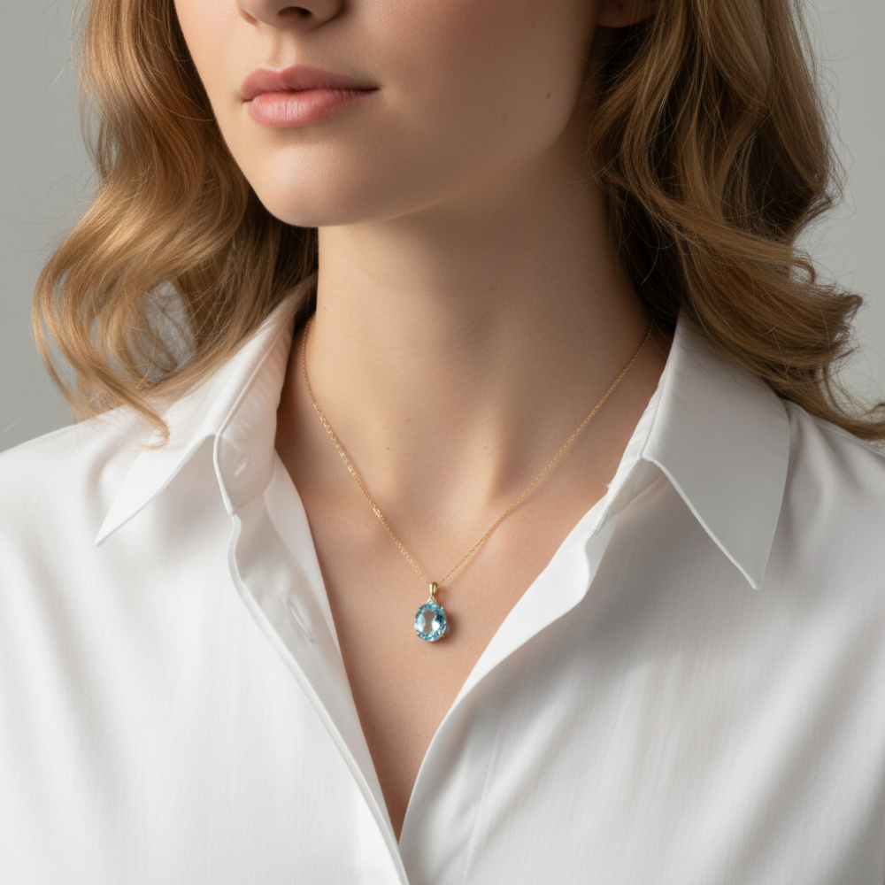 Pendentif en Or jaune 375 serti d'une topaze bleue traitée ovale de 12x10mm et d'un diamant