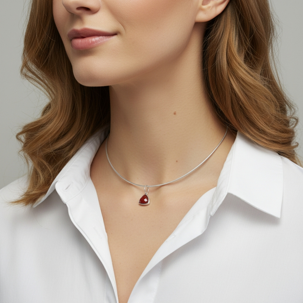 Ce pendentif à l'apparence coquette agrémentera avec légèreté la tenue de ces dames. Elles l'apprécieront pour sa tonalité colorée, car il est doté d'une cornaline en forme de triangle et taillée en dôme. La forme de la pierre donne de l'authenticité à ce bijou en plus de ces deux faces qui sont visibles. L'arrière de la pierre est en contact avec la peau. La monture qui l'accompagne est en argent et elle est constituée d'un mince filet pour entourer les côtés de la pierre avec une bélière en forme de cercle sur le haut.