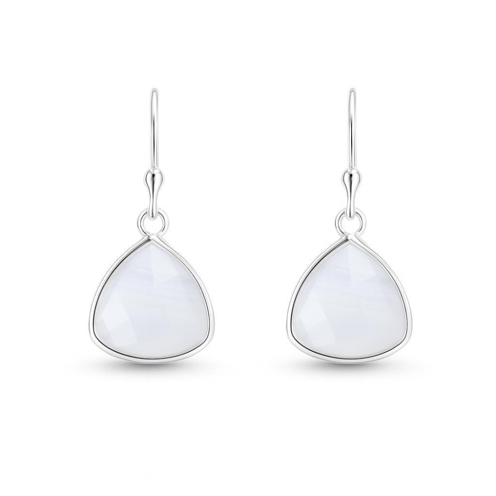 Intemporelles et toujours prisées par la gent féminine, ces boucles d'oreilles pour femme à la forme pendante illumineront votre visage. Elles sont agrémentées d'une calcédoine taillée en dôme. Chaque pierre présente une jolie forme triangulaire et elle est entourée d'une monture sur les côtés. Les pierres sont mises en valeur grâce à la monture qui laisse visibles ses deux faces. La calcédoine se distingue par sa couleur douce et elle s'accorde bien avec la tonalité de la monture qui est en argent rhodié. Ces ravissantes boucles d'oreilles sont faciles à porter avec ses crochets pendants au niveau des oreilles .