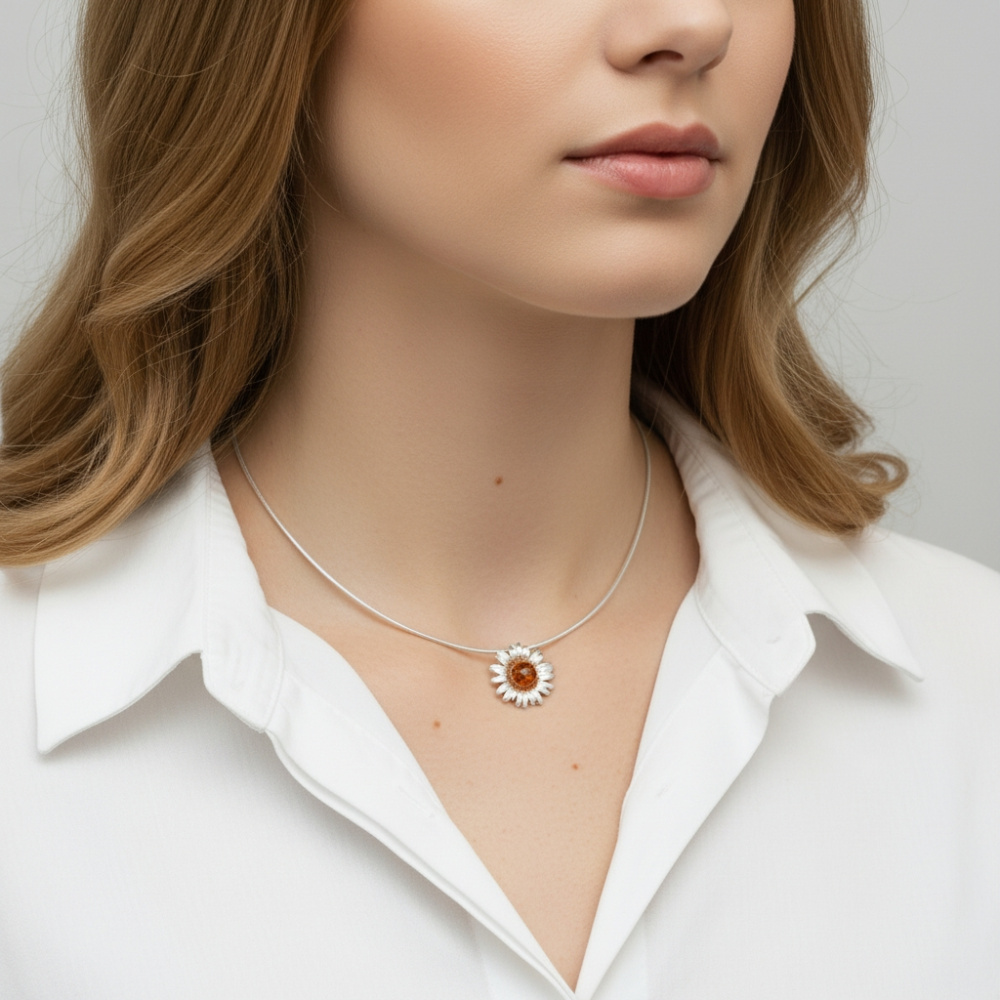 Pendentif Fleur Ambre rond 9mm sur Argent 925