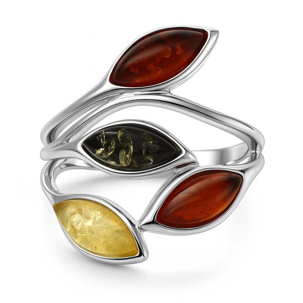 A porter au quotidien, cette bague en argent traversera les siècles sans jamais se démoder. Sa monture sophistiquée ne manquera pas de convaincre ces dames. Elle est constituée de plusieurs branches rappelant une fleur. Les extrémités desdites branches sont joliment ornées d'ambre taillés en navette de couleur verte, miel et cognac. Ces pierres fines aux tonalités végétales s'apprécient pour leur allure naturelle et printanière.