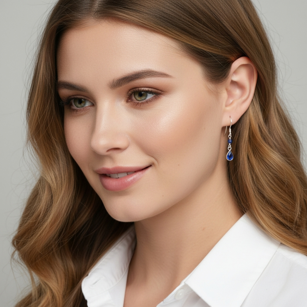 Une boucle est composée de deux lapis lazuli : la première est de forme ronde fixée par une tige qui passe à travers puis deux anneaux le relient au deuxième lapis lazuli en forme de poire.