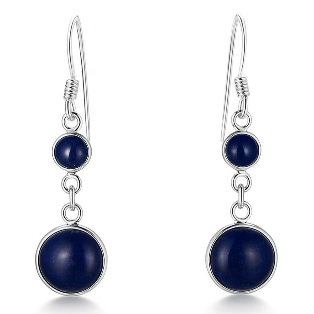 Ces boucles d'oreilles au style pendant siéront naturellement aux personnes aux visages ronds. Elles dessinent une forme en longueur avec le crochet et la monture qui les composent. Deux lapis lazuli sont montés sur la monture, une de taille plus petite et de forme ronde se trouve plus haut puis elle est unie à la deuxième pierre par des petits cercles qui s'entrelacent. La couleur sombre des pierres fait un beau contraste avec la brillance du métal en argent qui compose la monture.