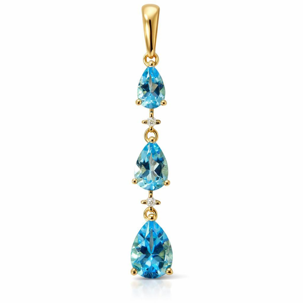 Les diamants rehaussent la monture en or jaune et les topazes bleues traitées en poire qui agrémentent ce bijou.