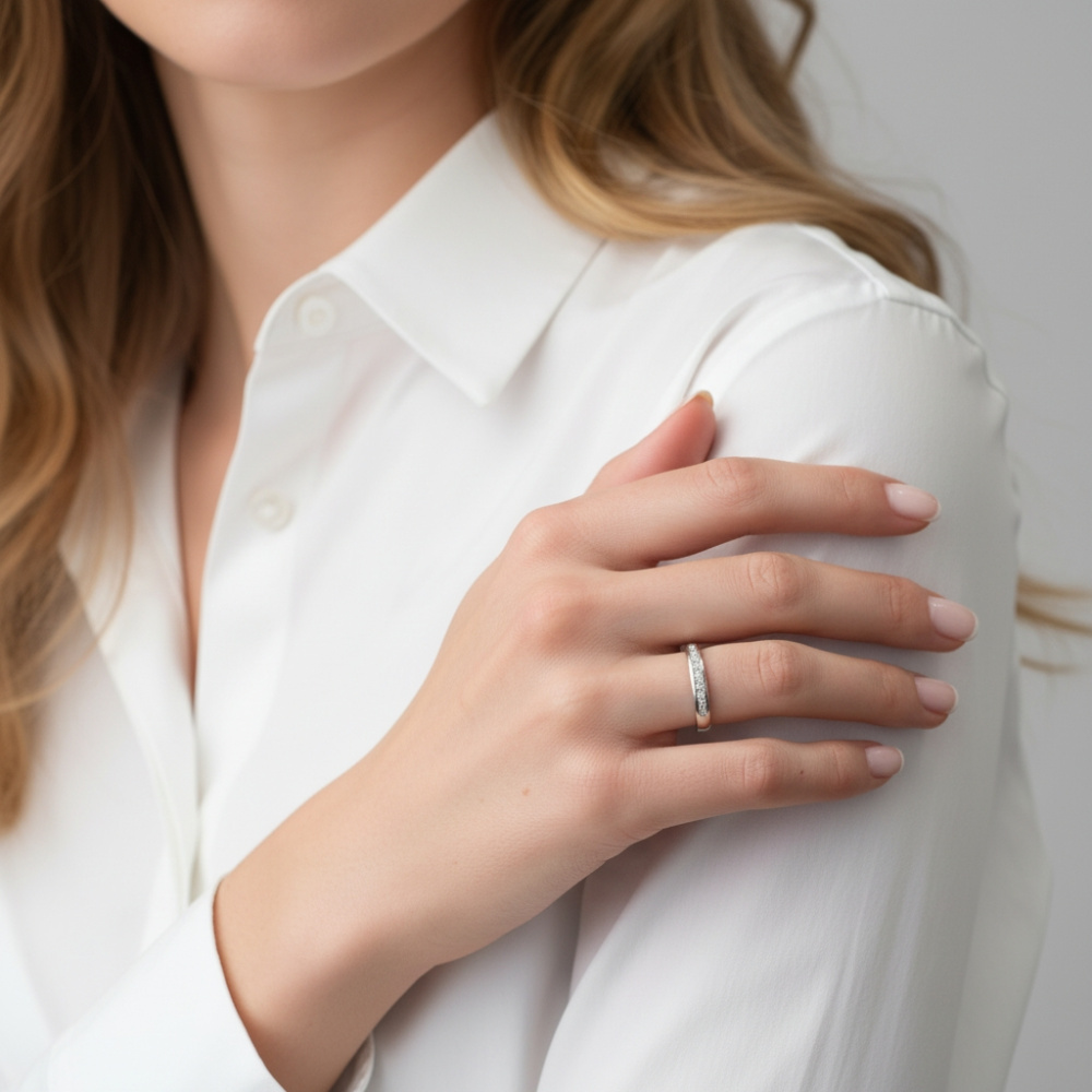 Appréciez le style contemporain de cette bague en or blanc. L'anneau dessine une forme régulière présentant une bonne largeur et pour apporter du confort à votre doigt, son intérieur est plat et lisse. Ce bijou se distingue par le sertissage des diamants sur le dessus, un serti rail qui lui donne de l'esthétisme. Neuf diamants brillent de tous leurs éclats sur cette demi-alliance que vous arborerez avec fierté au quotidien .