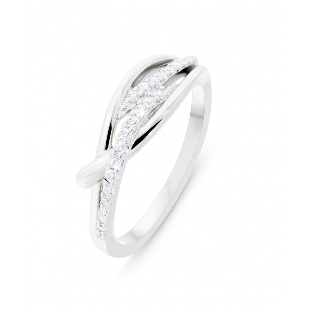 Cette ravissante bague à l'allure très moderne vous séduira pour son originalité. L'anneau n'en fait qu'un à la base, en remontant, il s'ouvre en deux puis se prolonge pour deux branches de chaque côté. Au total, on retrouve donc deux branches ornées d'oxydes de zirconium puis deux branches aux aspects satinés et épurés. Les branches s'entrelacent délicatement pour former un joli à l'ensemble de ce bijou en argent rhodié.