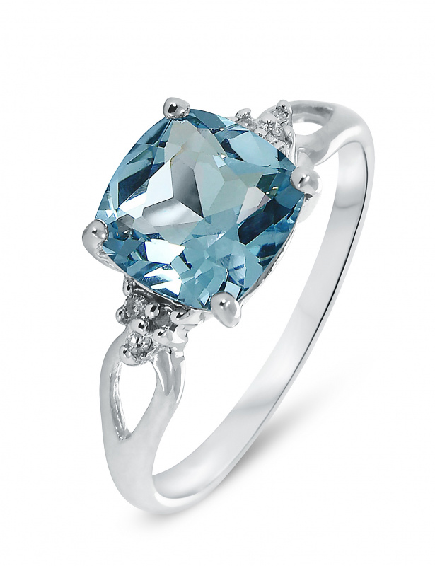 Bague Or blanc 375 Topaze Bleue traitée Coussin 8x8mm et Diamant